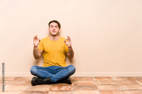 Young caucasian man sitting on the floor isolated relaxes after hard working day, she is performing yoga.