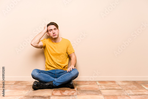 Young caucasian man sitting on the floor isolated tired and very sleepy keeping hand on head.