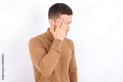 young caucasian man wearing grey turtleneck over white background Yawning tired covering half face, eye and mouth with hand. Face hurts in pain.