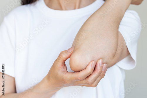 Young caucasian woman in white tshirt holding the elbow joint, experiencing pain from arthritis, elbow injury.