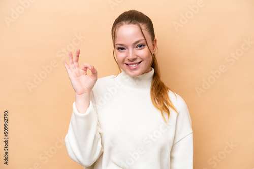 Young caucasian woman isolated on beige background showing ok sign with fingers