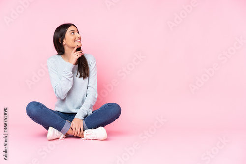 adult, attractive, background, beautiful, beauty, brunette, casual attire, caucasian, clueless, colours, colourful, concept, confused, cool, expressing, expression, fashion, female, imagining, hair, idea, imagine, isolated, lady, looking, pensive, people, person, pink, portrait, pretty, question, slim, smart, solution, thinks, thinking, thoughtful, thought, up, wall, woman, wonder, young, floor, full-length, girl, to sit