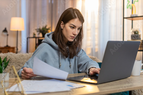 Young Caucasian woman sitting at table with laptop working on business plan looking focused typing text with documents spread around. Confident girl freelancer working from home in apartment room.