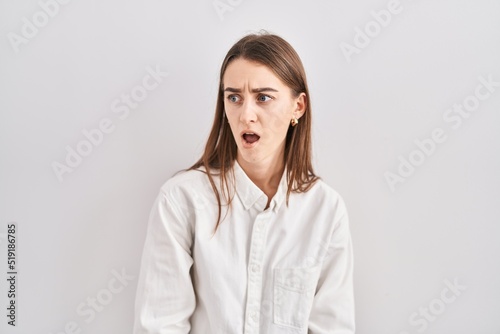 Young caucasian woman standing over isolated background in shock face, looking skeptical and sarcastic, surprised with open mouth