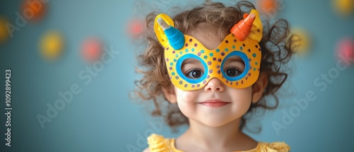 Young child dressed in a bright costume and colorful mask smiles happily, embodying the spirit of Purim celebrations in a fun, playful atmosphere