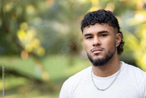 young men, portrait, serious, looking, direct, gaze, confidence, masculinity, identity, casual attire, outdoors, green background, natural light, facial, hair, beard, curly hair, male, adult, photogenic, thoughtful, support, pensive, expressive, fashion, style, modern, latin america, hispanic, diverse, multiracial, mixed race, head shot, closeup, daytime, spring, park, garden, tree, nature, contemplation, individuality, authenticity, lifestyle, man, 1, health