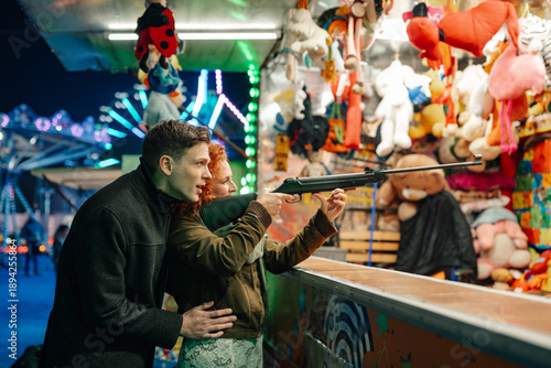 couple, amusement park, fairground, shooting gallery, fun, entertainment, aiming, rifle, human relationships, happiness, activity, leisure, carnival, evening, night, youth, adult, man, woman, attraction, game, skill, target, winning, prize, plush toy, stuffed animal, bonding, exciting, recreation, weekend, event, festive, bright, colourful, light, lifestyle, togetherness, romance, connection, support, assistance, playful, competition