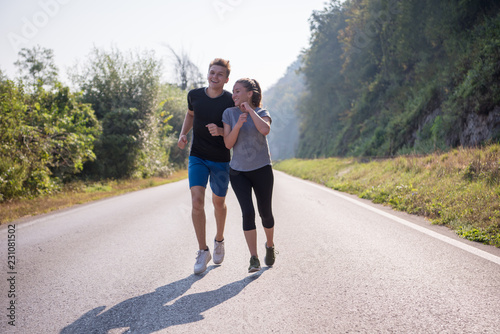 young couple jogging along a country road
