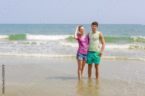 sea, people, day, outdoors, horizontal, colours, beach, holiday maker, couple, togetherness, wave, standing, together, real people, horizon, front view, young couple, short, smiling, two people, clear sky, woman, leisure, man, adult, young men