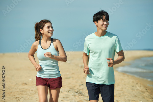 couple, running, beach, sea, ocean, water, summer, vacation, holiday, travel, coast, shore, sand, sky, blue, exercise, fitness, sport, physical exercise, young, adult, man, woman, together, healthy, lifestyle, casual attire, smiling, looking away, movement, energy, outdoors, nature, recreation, activity, jog, jogger, coastline, wave, sunlight, daylight, horizon, serene, peaceful, tranquil, get-away, enjoyment, human relationships, love