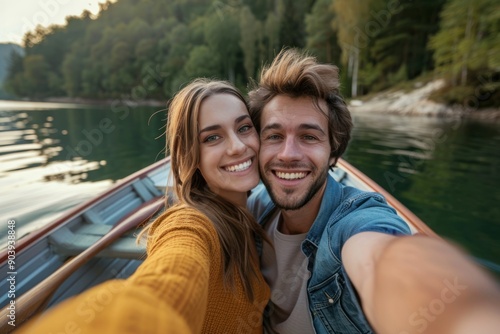 Young couple taking a selfie together on a boat in a lake