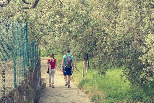 italy, trekker, hiker, sport, active, nature, adventure, freedom, walk, pair, couple, love, together, romance, wife, husband, 2, people, exploring, travel, tour tourism, olive, fruit farm, rear, view, vintage, retro, old, filter