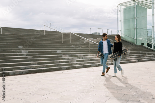 Young couple with skateboards walking near steps