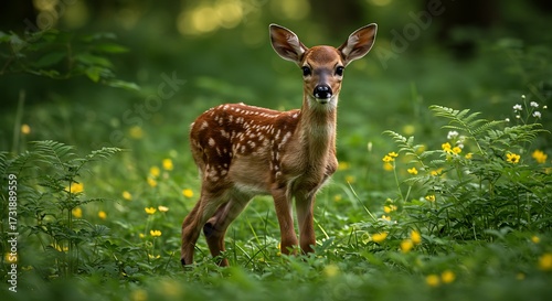 Young deer standing in green meadow surrounded by foliage and flowers