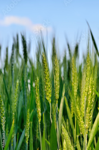 Young ears of grain on the background of blue sky