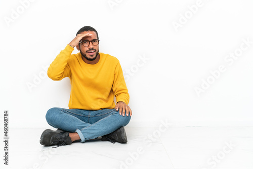 Young Ecuadorian man sitting on the floor isolated on white wall looking far away with hand to look something