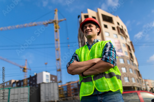 Young engineers man crossed hands at the construction. Young man holding a blueprint and looking at it with inspiration.