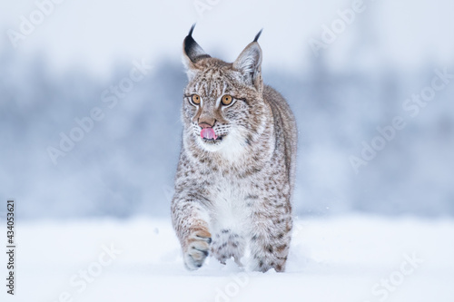 Young Eurasian lynx on snow. Amazing animal, walking freely on snow covered meadow on cold day. Beautiful natural shot in original and natural location. Cute cub yet dangerous and endangered predator.
