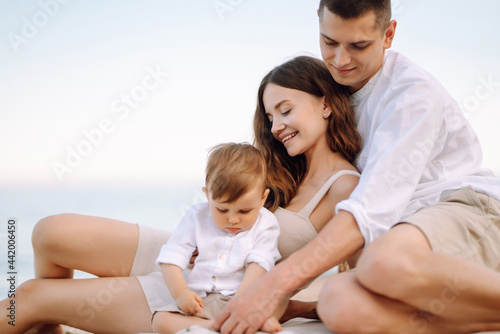 Young family on the beach. People are having fun on summer vacation. Father, mother and child against the background of the blue sea and sky. Travel, active lifestyle, vacation, rest concept.