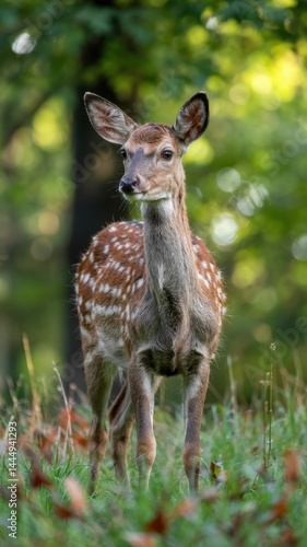 fawn, cervid, wildlife, field, forest, sunlight, people, blurred, background, natural, animal, young, spot, brown, white, alert, gentle, ear, outdoors, environment, standing, daylight, pasture, sharpened, watchful, camera, obscured, dappled, scene, tree, mammal, timberland, cute, vulnerable, wild, peaceful, naturalistic, timid, shade, shadow, clear, sunny, composition, baby, observation