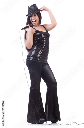 Young female singer with mic on white