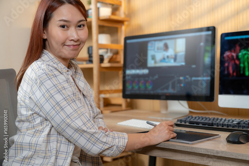 Young freelance female photographer working at home, sitting with laptop and editing photos, representing creativity, freelance lifestyle, and modern work from home