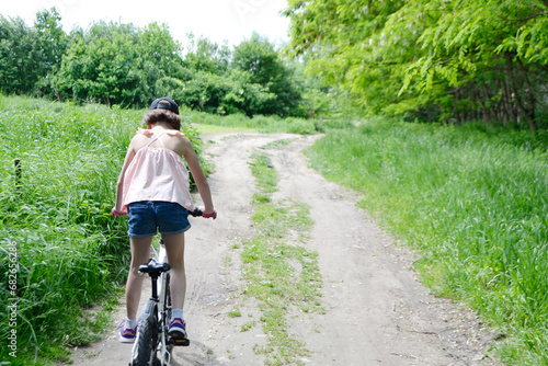 Young girl cyclist enjoy the beautiful sunrise on summer forest trail