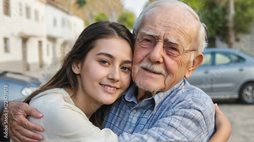 family, grandfather, granddaughter, hug, love, bond, connection, warmth, generation, elderly, young, caring, smile, happy, affection, togetherness, portrait, hugs, support, kind, gentle, close, nostalgia, parenthood, wisdom, bequest, respect, oneness, tenderness, emotional, trust, companionship, grandparent, heritage, memory, joyful, senior, childhood, kinship, protection, care, people, outdoors, together, happiness, retirement, lifestyle, smiling