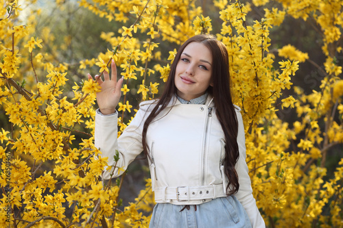 Young girl posing at the bush with spring flowers