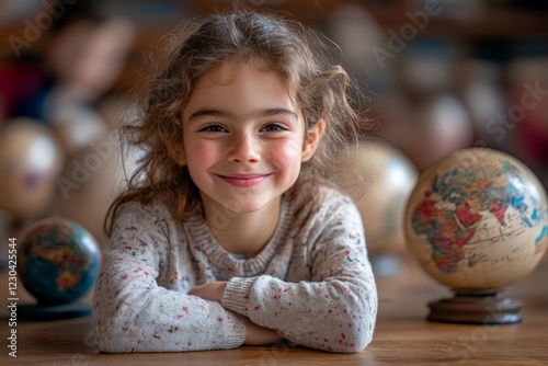 Young girl smiles warmly surrounded by globes in a classroom setting