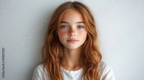 Young girl with flowing hair and a serene expression posing against a minimalist white background. Time concept with clock symbolism.