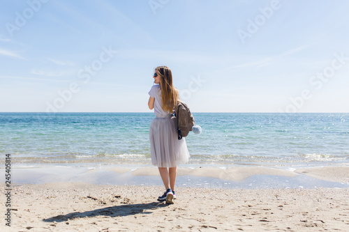 Young girl with long hair and bag on back is standing near sea. She wears lush gray skirt and gray T-shirt with sneakers. View from back.