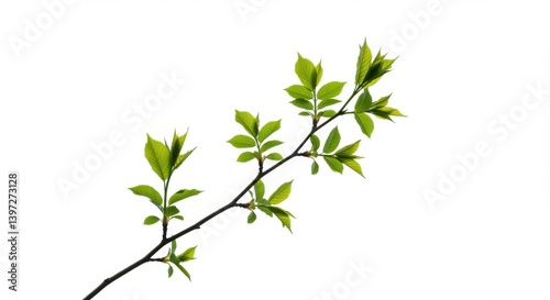 Young green leaves sprouting on a thin branch against a bright white background in spring season