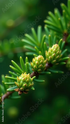 Young green pinecones developing on a pine branch , texture, close up, unripe