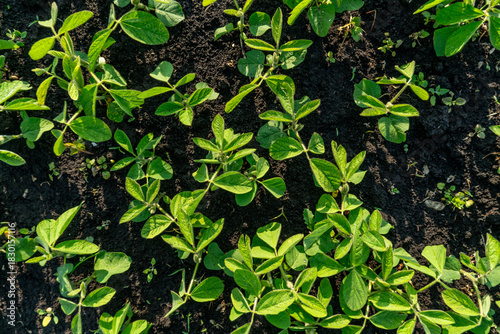 Young green plants grow vigorously in dark fertile soil. Fresh sprouts show new life and agricultural promise under natural sunlight.