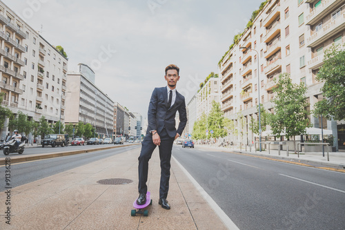 man, model, young, cute, photogenic, pretty, guy, male, asian, filipino, posing, attractive, fashion, look, deep, person, intense, expression, cool, lifestyle, style, people, modern, youth, stylish, casual attire, expressive, boy, portrait, street, urban, alone, blazer, jacket, attaching, skateboard, skate, skateboarding, skater, skateboarder, businessman, serious, pensive, thoughtful, standing