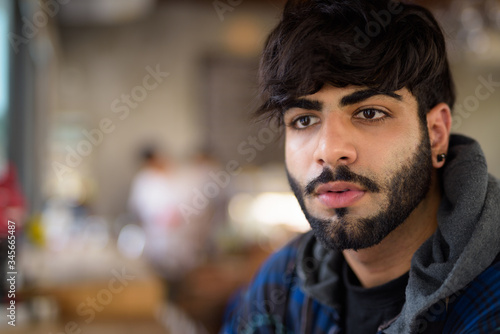 Young handsome bearded Indian hipster man at the coffee shop
