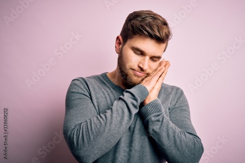 Young handsome blond man with beard and blue eyes wearing casual sweater sleeping tired dreaming and posing with hands together while smiling with closed eyes.