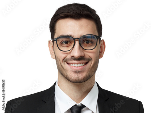 Young handsome businessman in glasses wearing black formal suit, white shirt and tie, looking confident and smiling