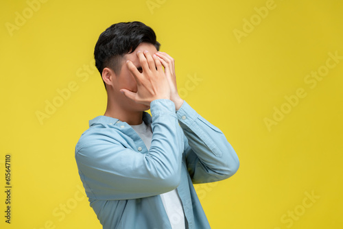Young handsome holding his head looking desperate isolated on yellow background