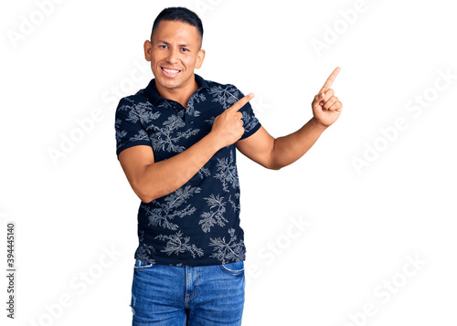 Young handsome latin man wearing casual clothes smiling and looking at the camera pointing with two hands and fingers to the side.