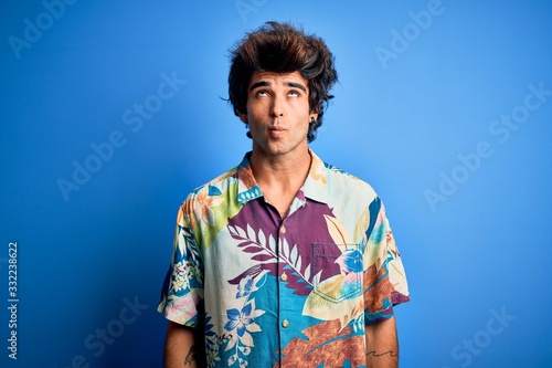 Young handsome man on vacation wearing summer shirt over isolated blue background making fish face with lips, crazy and comical gesture. Funny expression.