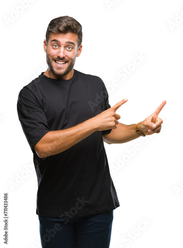 Young handsome man over isolated background smiling and looking at the camera pointing with two hands and fingers to the side.