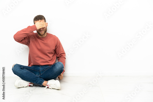 Young handsome man sitting on the floor covering eyes by hands. Do not want to see something