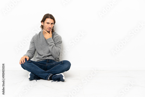 Young handsome man sitting on the floor over isolated background thinking
