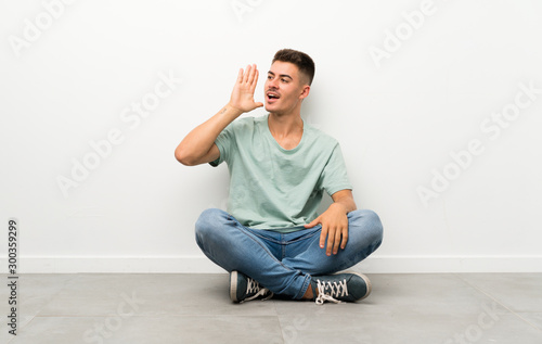Young handsome man sitting on the floor shouting with mouth wide open