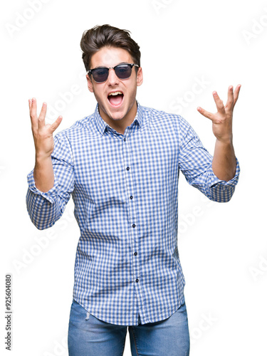 Young handsome man wearing sunglasses over isolated background crazy and mad shouting and yelling with aggressive expression and arms raised. Frustration concept.