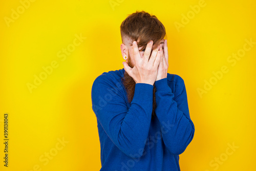 Young handsome red haired bearded man standing against yellow wall covering face with hands and peering out with one eye between fingers. Scared from something or someone.