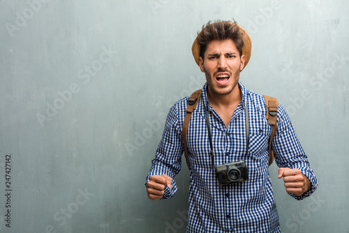 Young handsome traveler man wearing a straw hat, a backpack and a photo camera screaming angry, expression of madness and mental instability, open mouth and half-opened eyes, madness concept