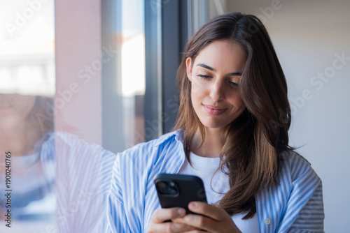 Young happy businesswoman smiling and using smart phone at home. Person standing near a window using smartphone indoors. Online education, order, working or shopping concept